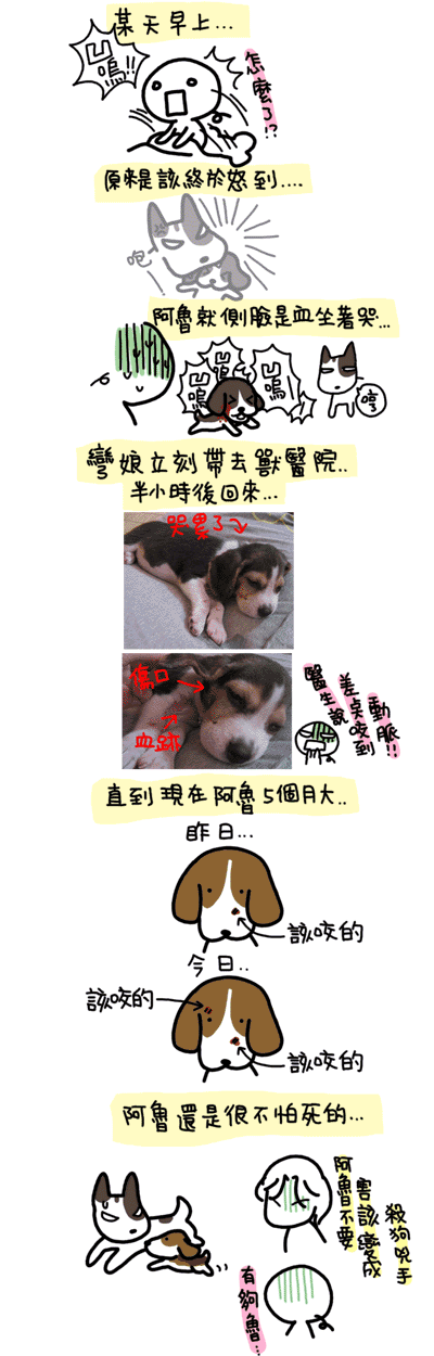 不過雖然傷口是該該咬的 但是該該真的是很穩重很成熟的狗 這樣的該該會動怒.. 就知道阿魯有多白目了.... 話說前幾天阿魯又在搗亂.. 把桌上的碗打破了.. 臉上的傷又添一條.. 臉上的傷痕比流氓還多的阿魯...